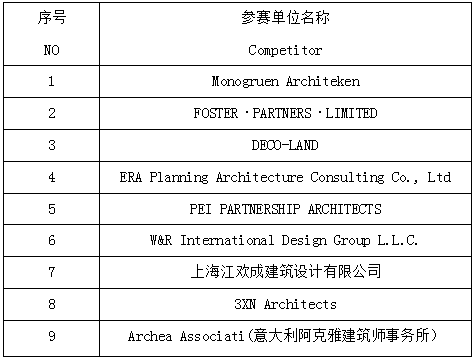 五、針對(duì)最終入選單位數(shù)量增加的說(shuō)明 ⅴ. Instructions 原公告中,原5家入圍設(shè)計(jì)機(jī)構(gòu),現(xiàn)調(diào)整為8家入圍設(shè)計(jì)機(jī)構(gòu)。最終獎(jiǎng)項(xiàng)設(shè)置調(diào)整為: In the original announcement,We should collect 5 enclosing design agencies, and now 9 contestants are shortlisted . We finally adjusted the bonus set: 一等獎(jiǎng)(1名),獎(jiǎng)金人民幣50萬(wàn)元,中選方案的設(shè)計(jì)機(jī)構(gòu)將與征集人另行簽定與本項(xiàng)目總體設(shè)計(jì)概念方案深化服務(wù)及其它設(shè)計(jì)咨詢服務(wù)相關(guān)事項(xiàng)的協(xié)議,中選人本次獎(jiǎng)金也將在總體設(shè)計(jì)費(fèi)中進(jìn)行抵扣; 1. The platinum winners may win a bonus of RMB 500,000,However which would be considered as a deductible consideration in an agreement signed separately with the organizer regarding to consequential services related to the master design concept of the project and other design consulting services. 二等獎(jiǎng)(2名),獎(jiǎng)金分別為人民幣30萬(wàn)元; 2. Gold prize (two winners), RMB 300,000 for each; 三等獎(jiǎng)(6名),獎(jiǎng)金分別為人民幣10萬(wàn)元。 3. Silver prize (six winners) RMB 100,000 for each.