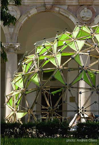 該項目在首次試驗之后于2006年完工,為當(dāng)今無損并易于組裝的新型材料及機械連接做出了進(jìn)一步的詮釋。竹制網(wǎng)格狀球頂原型——被切割成板狀的竹子通過鋼材與氯丁橡膠相連,形成一種復(fù)雜并具有靜態(tài)性能的網(wǎng)格狀幾何(此結(jié)構(gòu)可承受自身約30倍的重量)——輕快,時尚,功能多樣。玻璃面板及光伏電池集成,與半透明的紡織物構(gòu)成了外層包膜,而夯土地面則為其提供了穩(wěn)定性。