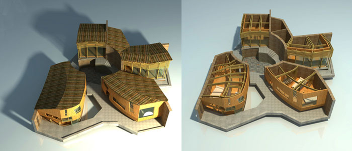 The hotel is intended as a spiral lies on the flat farmland, the spiral slab which gradually upraises rooms onto different levels with an uninterrupted incline, reminiscently responds the existing preserved dragon kilns in the site. On that account, the hotel is taken into consideration from dragon kiln through sloping slab, instead of standard rooms. Structurally, the hotel is consisted of two components, the core bearing wall made of bricks fired in local kiln, and the posts ranged along the contour of the irregular circumference, made of 100mm diameter local bamboos.