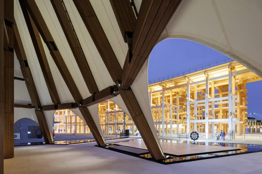 隈研吾建筑工作室(Kengo Kuma and Associates)在2025年大阪世博會(huì)卡塔爾館的扇形木結(jié)構(gòu)上拉起了白色織物,其中包含由荷蘭AMO工作室設(shè)計(jì)的展覽。