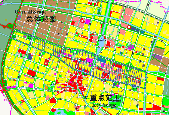 The planning scope is divided into two levels: Overall Scope and Key Scope, in which: the Overall Scope is to Zhangyang Highway in the north, Shugang Expressway in the west, Dongheng River in the south, and Ergan River in the east, with a total area of about 900 hectares, and the Renmin Road section is about 9 kilometers long; the Key Scope is to Zhangyang Highway in the north, Huancheng River in the west, Donghen River in the south and Jiangcheng Road in the east (see attached drawing for details).
