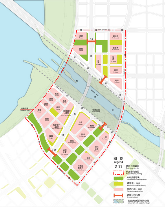 競賽方案設計范圍:需進行方案設計的公共空間用地為下圖所示G8、G9、G11、G14+綠色填充范圍,總用地面積82232 m2,公共空間地下和地上的配套公共建筑面積總計23800 m2以及下圖所示的4座跨街公園。