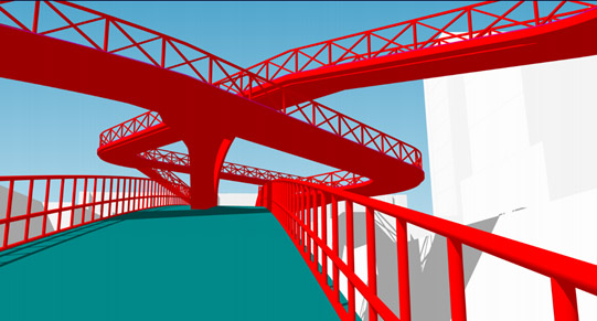 在保證交通、觀景功能以外,我們設計思考的重點就是如何將北廣場與人行天橋有機結(jié)合到一起,從而釋放出無限的可能。形式上我們采用圓形,從而保留北廣場的完整性,包裹出一個“內(nèi)部”廣場。將北側(cè)的豎向交通面拉大并壓低,這樣整個豎向樓梯就與廣場看臺形成一體,廣場就變成了舞臺,橋就變成了看臺,形成社區(qū)居民的公共活動空間和公共舞臺,契合了我們小區(qū)的規(guī)劃理念。通過橋底曲面支撐的處理保證了美觀性和結(jié)構(gòu)的可行性。結(jié)合周邊建筑的色彩,我們用白色混凝土來澆筑整個橋體,使其與周邊協(xié)調(diào)統(tǒng)一,相輔相成。