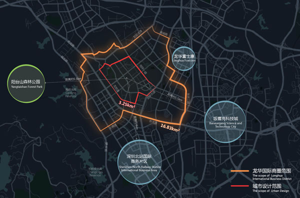 The present international competition consists of two levels, namely the scope of urban design and the scope of conceptual architecture design . The former covers an occupation of approximately 325 hectares, including the range of Donghuan First Road, Longhua Avenue, Industry Road, Longsheng Road and Park Road (refer to the white scope line on map below). Among those, there are three key projects for conceptual architecture designs, namely the project of Longhua Business Center, the project of Longhua Third Industrial Zone as well as the intended shanty-area renovation project of the Core Zone.