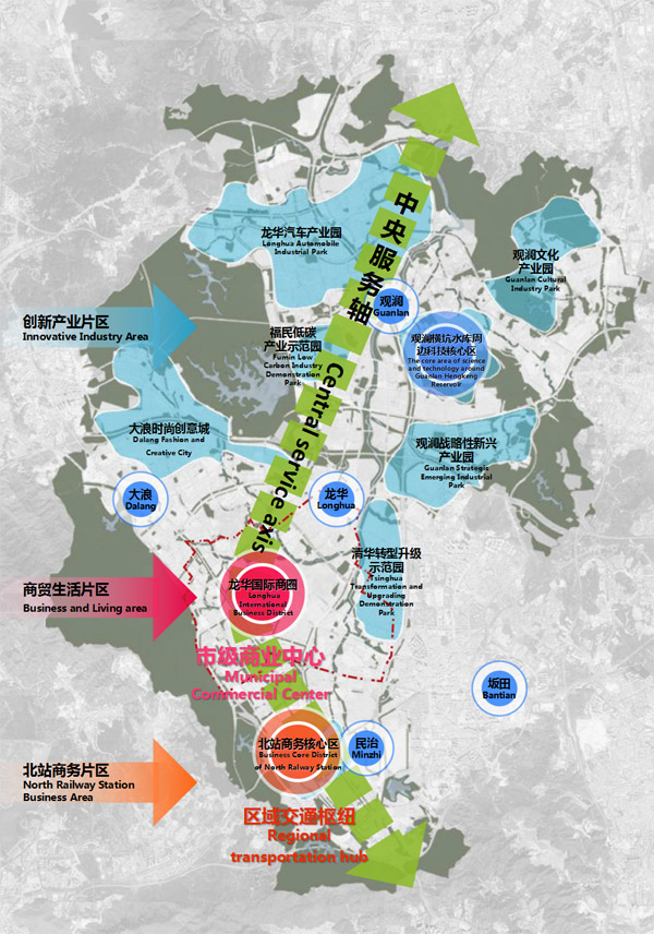 Sketch Map of the Central Service Axis of Longhua District ©Research on the Spatial Planning of the Urban Renewal Area of Modern Commercial City in Longhua District