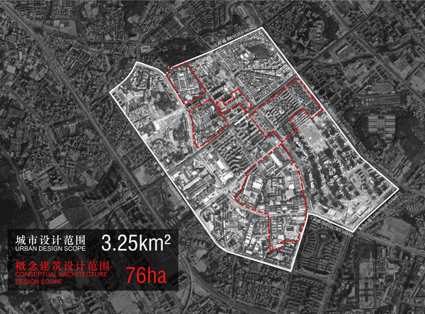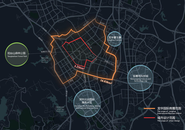 The present international competition consists of two levels, namely the scope of urban design and the scope of conceptual architecture design. The former covers an occupation of approximately 325 hectares, including the range of Donghuan First Road, Longhua Avenue, Industry Road, Longsheng Road and Park Road (refer to the white scope line on map below). Among those, there are three key projects for conceptual architecture designs, namely the project of Longhua Business Center, the project of Longhua Third Industrial Zone as well as the intended shanty-area renovation project of the Core Zone.
