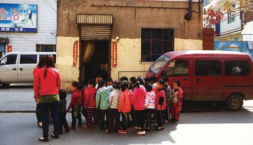 鄭州一所幼兒園的小朋友在老師的指引下站隊。子女教育是農(nóng)民工家庭在城市應(yīng)該享有的公共服務(wù)之一。(攝影/朱騫)