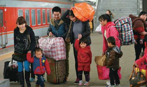 2013年2月26日,貴陽火車站迎來元宵節(jié)后返程客流又一高峰,處處是拖家?guī)Э诘穆每瓦M站上車。返鄉(xiāng)農(nóng)民工是主要的春運乘客,他們期待真正變成工作所在城市的居民。(圖片/東方IC)