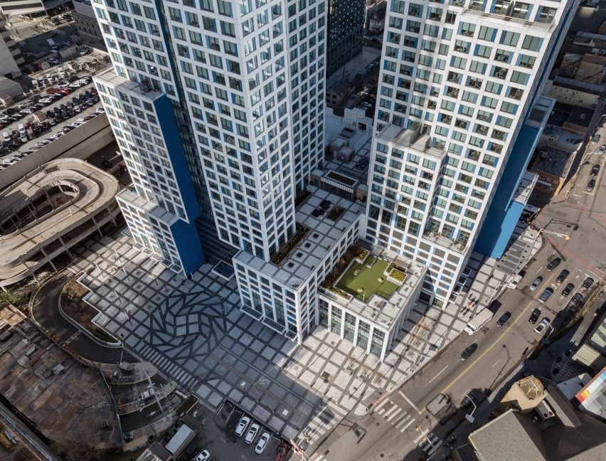在底部,工作室設(shè)計了每座塔樓“與地面輕輕連接”,以創(chuàng)建直接連接到建筑大廳的開放式公共廣場。